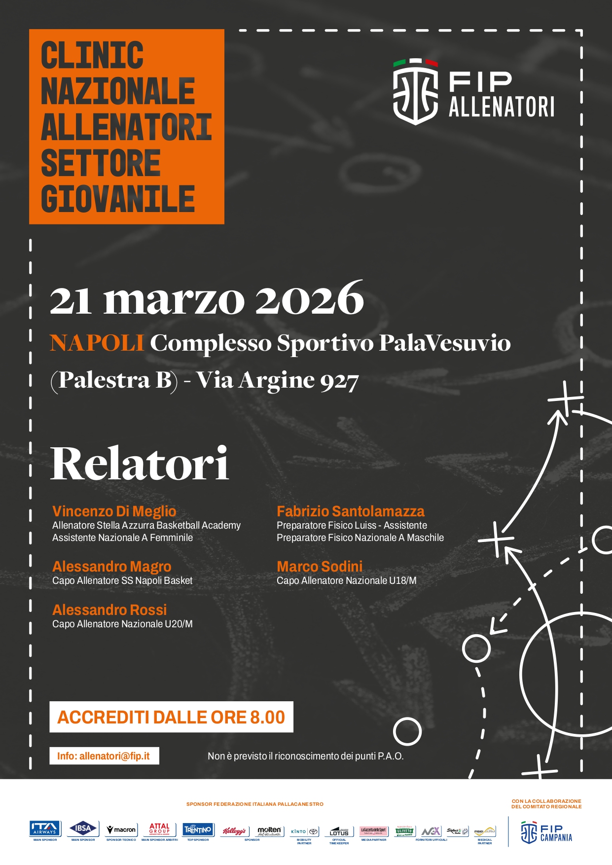 Il C.N.A., in collaborazione con il Comitato Regionale Campania, organizza il Clinic per Allenatori di Settore Giovanile per il centro/sud che si svolgerà a Napoli presso il Complesso Sportivo PalaVesuvio (Palestra “B”) sito in Via Argine 927, il giorno 21 marzo 2026.