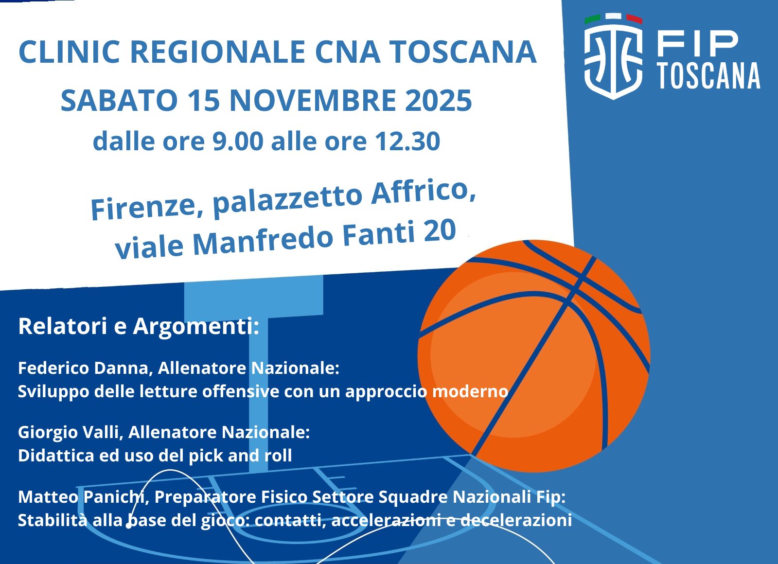 Comunichiamo che il Cna Toscana organizza un clinic di aggiornamento per allenatori che si svolgerà SABATO 15 NOVEMBRE 2025 a Firenze dalle ore 09.00 alle ore 12.30 presso il palazzetto Affrico, via Manfredo Fanti 20.