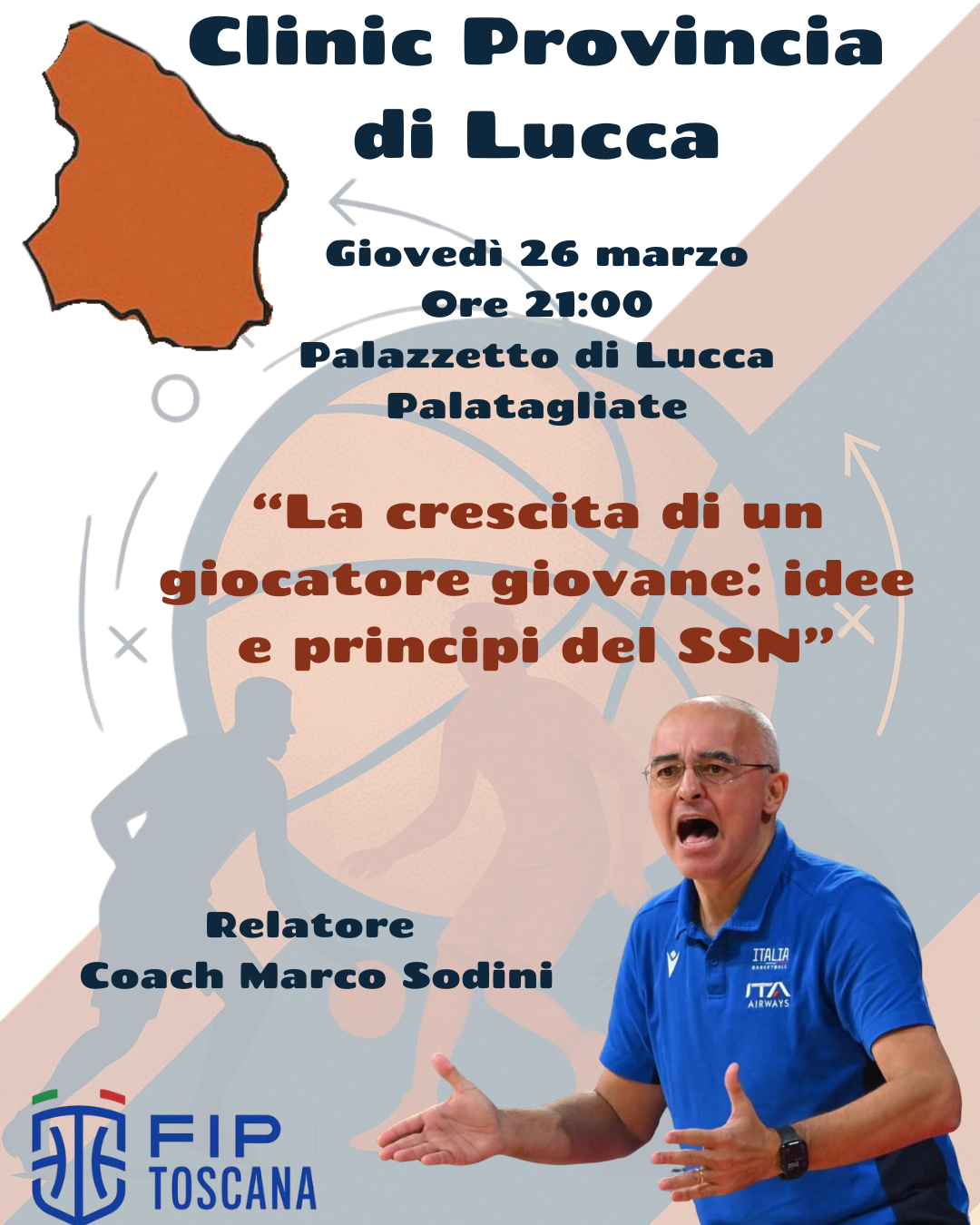 Comunichiamo che il CNA della provincia di Lucca, in collaborazione con il CNA Regionale organizza un Clinic di aggiornamento per gli allenatori che si svolgerà GIOVEDI 26 MARZO 2026 alle ore 21.00 presso il palaTagliate, via delle Tagliate, Lucca con relatore Marco Sodini, allenatore Nazionale Under 18 Maschile.
