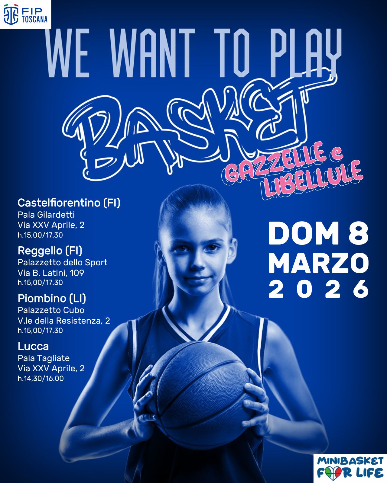 In occasione della Giornata evento di promozione dell’attività femminile Minibasket “We Want To Play Basketball” prevista per la Festa della Donna DOMENICA 8 MARZO 2026 promossa dal Settore Minibasket Fip e organizzata dalla FIP Toscana si svolgeranno le seguenti iniziative:
